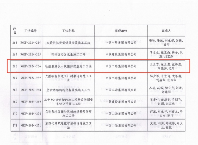 近日,從內蒙古自治區住房和城鄉建設廳傳來喜訊,市政分公司申報的《輕型泄爆板安裝施工工法》成功獲評2024年度內蒙古自治區省級工法。