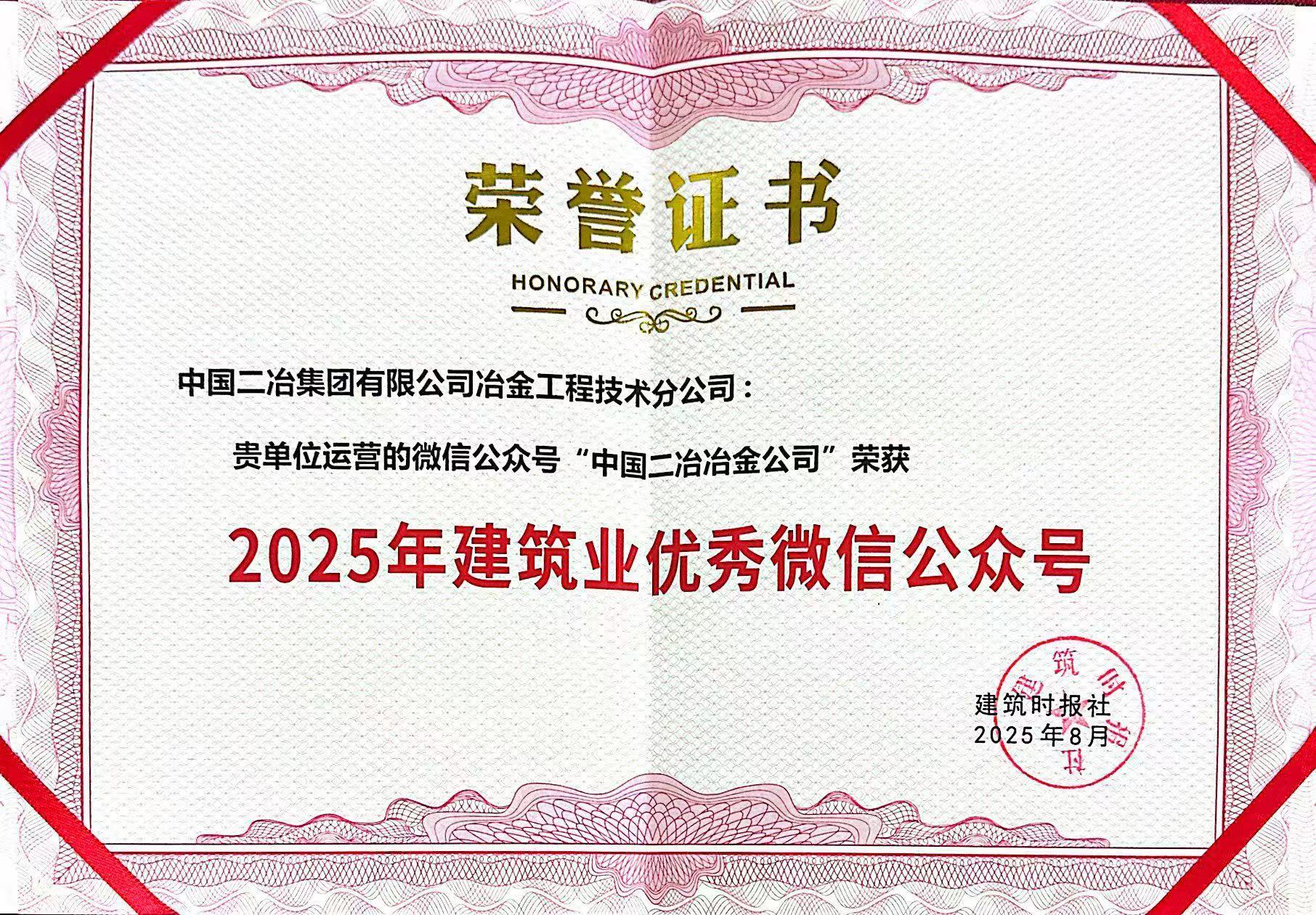 近日,中國二冶冶金分公司運營的微信公眾號榮獲建筑時報社頒發的“2025年建筑業優秀微信公眾號”稱號。這一榮譽不僅是對冶金分公司新媒體運營工作的充分肯定,更是對中國二冶品牌影響力和企業文化傳播力的高度認可。