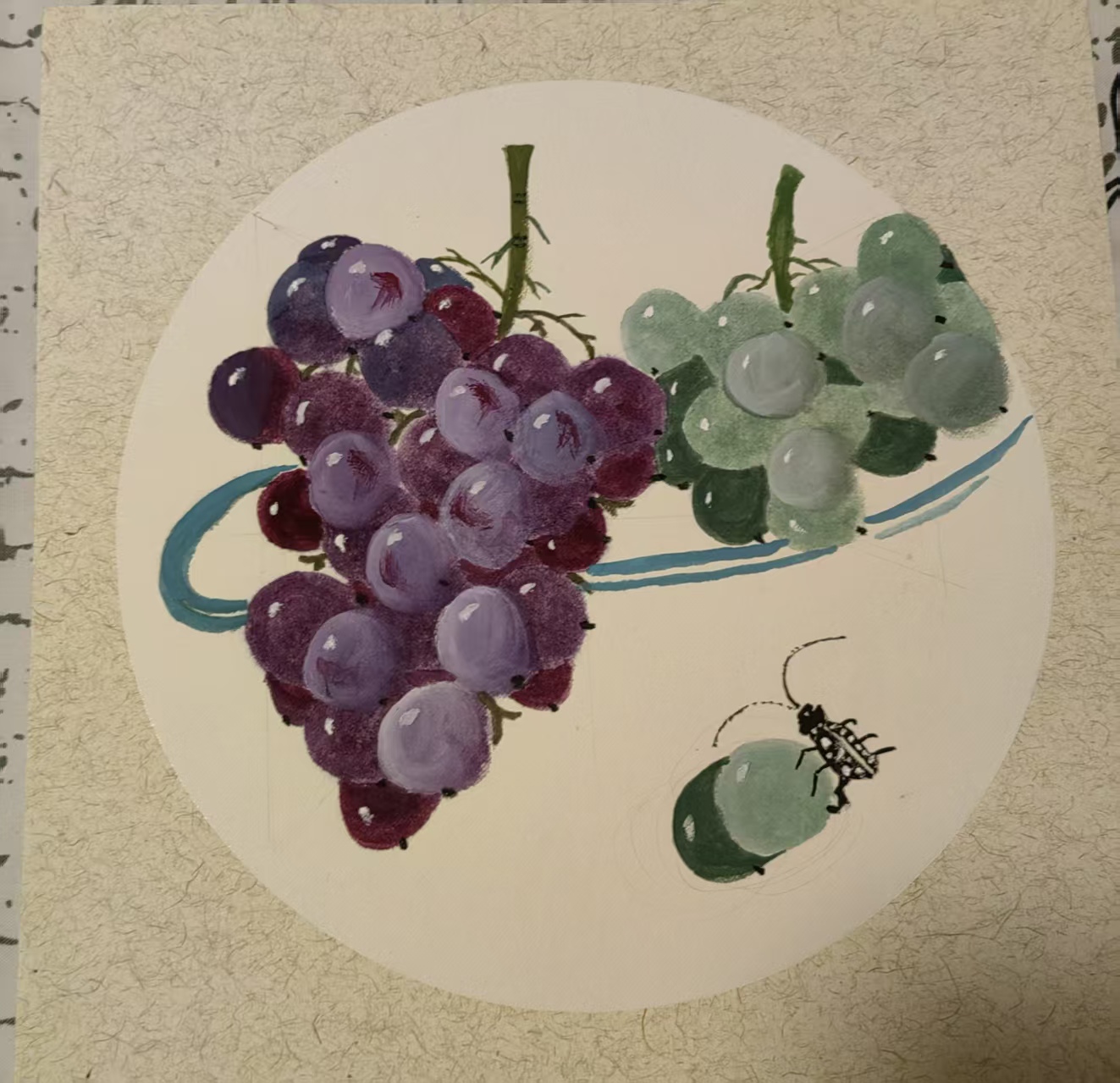 畫作以葡萄為主題,葡萄串串飽滿,如累累碩果掛滿枝椏,既展現出自然的生機與豐饒之美,也象征中國二冶員工在工作中收獲的成果與希望,傳遞出積極向上、碩果累累的美好寓意。