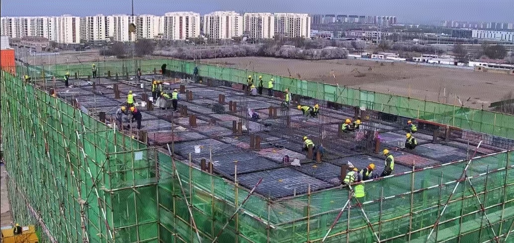 本項目坐落于包頭稀土高新區(qū)朝陽路以東,騰飛大街以南,凌云路以北,星輝路以西,總建筑面積8638平方米。其中,綜合樓建筑面積為7126.10平方米,主體為7層框架混凝土結(jié)構(gòu),建筑全長50.8米、寬33.9米、高23.95米,是本項目最大的核心工程。工程開工建設(shè)后,項目部突破綜合樓外觀設(shè)計造型復(fù)雜、大體積混凝土澆筑技術(shù)難度大、施工任務(wù)艱巨等難題,采用分段分層穿插作業(yè)施工方法,合理緊湊安排關(guān)鍵施工工序,嚴(yán)格執(zhí)行“三檢制”,持續(xù)加強過程管控,履行“多層級技術(shù)交底”,確保項目在保證安全、質(zhì)量的前提下,實現(xiàn)封頂目標(biāo)。