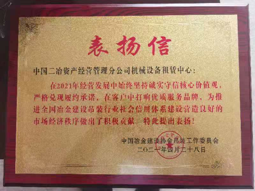 表揚(yáng)信指出:中國(guó)二冶資產(chǎn)公司機(jī)械設(shè)備租賃中心在2021年經(jīng)營(yíng)發(fā)展中始終堅(jiān)持“誠(chéng)實(shí)守信 合作共贏”核心價(jià)值觀,嚴(yán)格兌現(xiàn)履約承諾,在客戶中打響優(yōu)質(zhì)服務(wù)品牌,為推動(dòng)全國(guó)冶金建設(shè)吊裝行業(yè)社會(huì)信用體系建設(shè)、營(yíng)造良好市場(chǎng)經(jīng)濟(jì)秩序做出了積極貢獻(xiàn)。