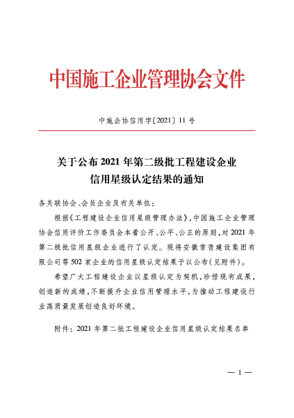 6月28日,工程建設行業信用體系建設平臺(中施企協信用字【2021】11號)發布2021年第二批工程建設企業信用星級認定結果,中國二冶獲得“工程建設企業信用星級18星級”。