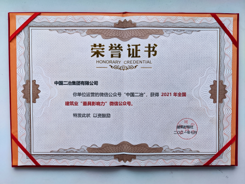 “中國二冶”微信公眾號憑借獨特的審美設計能力、深入透徹的分析思考、及時準確的新聞資訊和豐富精彩的企業(yè)文化互動方式,以及引起廣泛關注和討論的大量原創(chuàng)觀點,在孜孜不倦的運營、維護、更新下,終獲肯定,榮獲“2021年全國建筑業(yè)最具影響力公眾號”的榮譽稱號;此獎項的獲得進一步提升了中國二冶的品牌知曉度和社會影響力,為公司高質(zhì)量穩(wěn)健發(fā)展營造了良好氛圍。