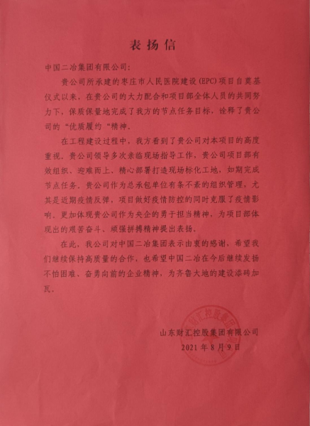 8月9日,中國(guó)二冶收到業(yè)主單位山東財(cái)匯控股集團(tuán)有限公司的表?yè)P(yáng)信,來(lái)信對(duì)中國(guó)二冶集團(tuán)科學(xué)組織、精心部署表示感謝,對(duì)棗莊人民醫(yī)院建設(shè)(EPC)項(xiàng)目當(dāng)前的各項(xiàng)工作進(jìn)展情況給予了高度贊揚(yáng)。
