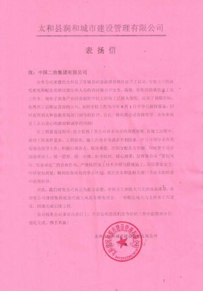 信中太和縣潤和城市建設(shè)管理有限公司對中國二冶在各方面的工作支持深表感謝,希望中國二冶繼續(xù)保持優(yōu)良的施工風(fēng)范及服務(wù)理念,一如既往地大力支持該工程建設(shè),圓滿完成后續(xù)工程。并表示愿與中國二冶集團有限公司在今后的工作中能精誠合作,共鑄輝煌!