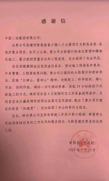 中國二冶收到新昌縣人民政府感謝信