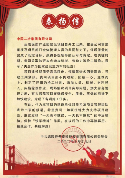 10月19日,綿陽經開投資控股集團有限公司向中國二冶致表揚信,對中國二冶生物醫藥產業園項目在建設過程中精心組織施工和辛勤付出給予表揚,同時對項目管理團隊在高溫限電、疫情防控期間,表現出頑強拼搏的施工風范高度贊賞。
