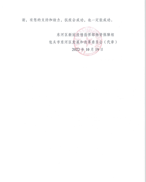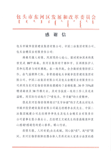 感謝信中寫道,面對突如其來的新冠肺炎疫情,全市廣大共產(chǎn)黨員、醫(yī)護人員、公安干警、下沉干部、社區(qū)工作者、防疫志愿者等,以“一家不圓萬家圓”的奉獻精神,以“不教胡馬度陰山”的英雄氣概,不懼風險,不舍晝夜,不辭辛勞,持續(xù)奮戰(zhàn)在醫(yī)療服務(wù)、隔離管控、交通卡點、流調(diào)排查、核酸檢測、物資配送、消殺保潔等戰(zhàn)線上,為全市打贏疫情防控攻堅戰(zhàn)作出突出貢獻。中國二冶主動踐行抗疫精神,勇于擔當,星夜兼程完成3個疫情防控隔離點改造建設(shè)任務(wù),疫不容辭、奮力搶拼包頭市防疫隔離點項目建設(shè)任務(wù),及時向東河區(qū)政府捐贈防疫物資,為抗疫一線工作人員送去溫暖,為包頭市東河區(qū)疫情防控工作提供有力保障,彰顯了中國二冶“愛包頭、做貢獻”大愛無疆的奉獻精神,充分體現(xiàn)了新時代駐包央企的新?lián)斝伦鳛椤R咔槊媲?,聞令而動,毅然逆行,勇挑重任,全力以赴,讓黨旗在包頭市疫情防控一線高高飄揚。再次感謝中國二冶的愛心善舉,暖心行動。感謝中國二冶干部職工,用一腔忠誠和熱血,用骨子里的澎湃激情凝聚成打贏這場疫情阻擊戰(zhàn)的強大合力!病毒無情人有情,風雨同舟向前進,危難之際顯身手。