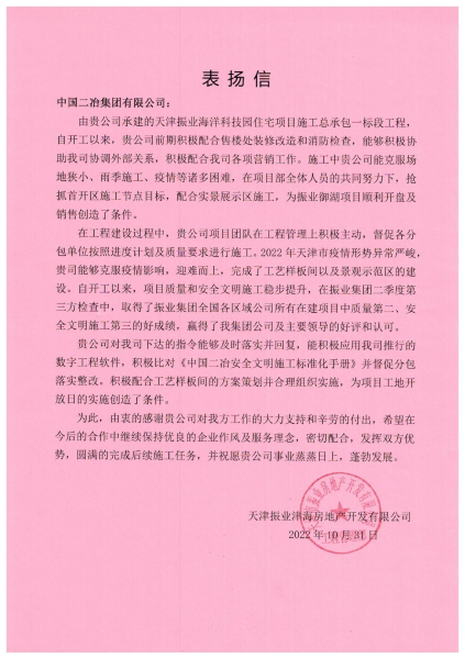 表揚信中指出,自開工以來,中國二冶天津振業海洋科技園住宅一標段項目部積極配合售樓處裝修改造和消防檢查,積極協調外部關系,搶抓首開區施工節點目標,配合實景展示區施工,為振業御湖項目順利開盤及銷售創造了條件。