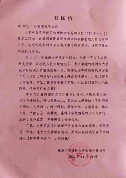 11月24日,中國二冶收到株洲市石峰區(qū)住房和城鄉(xiāng)建設(shè)局發(fā)來的表揚信,對中國二冶承建的株洲恒大譽苑項目自4月26日復(fù)工以來的項目管理舉措及突發(fā)疫情情況下的央企擔(dān)當(dāng)表示肯定,對項目管理團(tuán)隊表示贊揚。