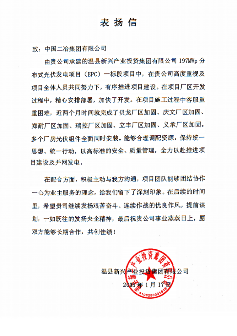 溫縣新興產業投資集團有限公司在信中寫道,自項目開工以來,在公司領導和項目全體建設者的共同努力下,精心安排部署,層層壓實責任,克服重重困難,近兩個月時間,完成了多個廠房光伏組件安裝任務。在建設過程中能夠發揮央企精神、踐行責任擔當,積極主動溝通,合理調配資源,全方位推動項目的優質履約,希望雙方能夠長期合作,共創佳績。