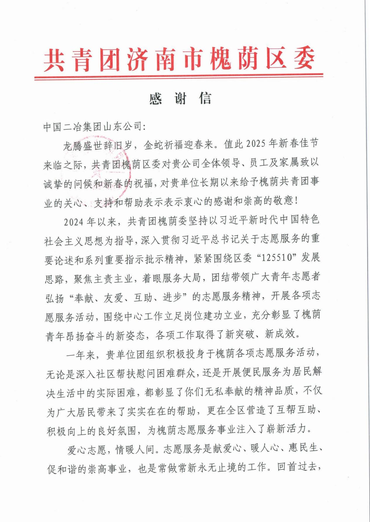 共青團濟南市槐蔭區委致中國二冶感謝信