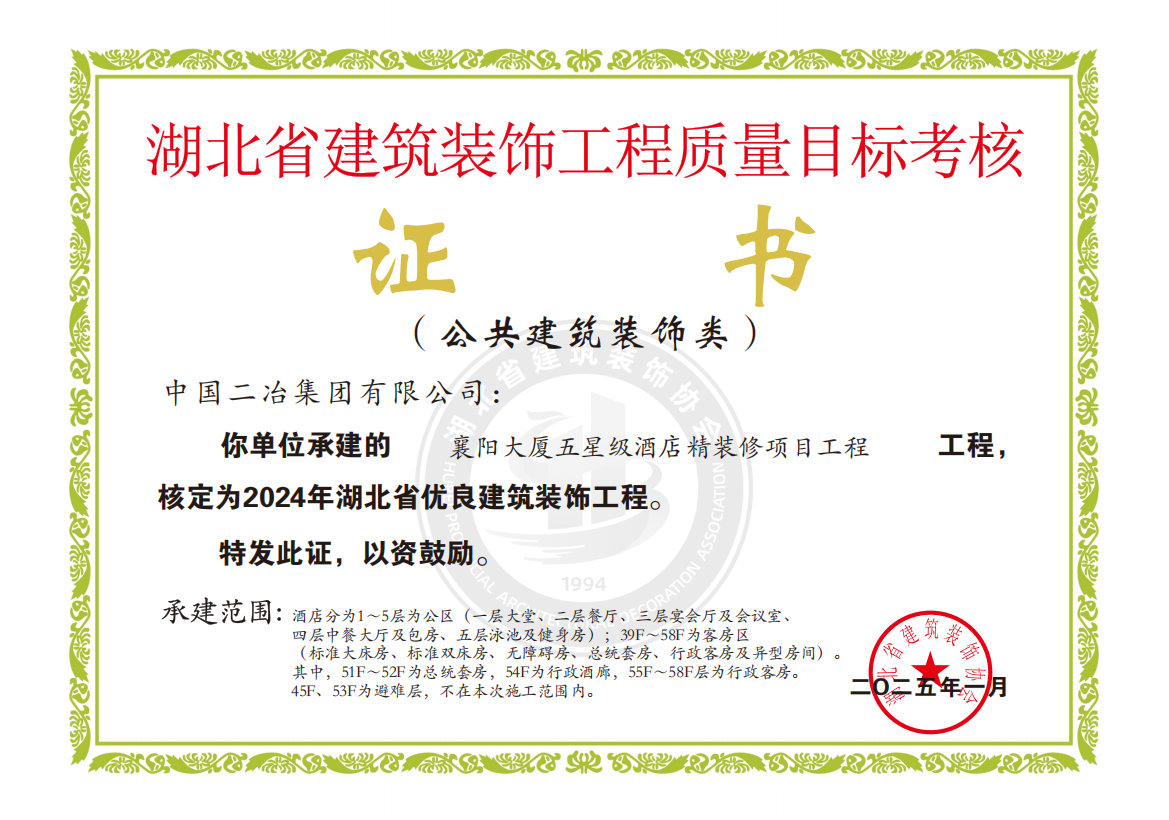 近日,湖北省建筑裝飾協(xié)會發(fā)布2024年度“湖北省優(yōu)良建筑裝飾工程”評選結(jié)果,中國二冶襄陽大廈五星級酒店精裝修項目榮獲2024年“湖北省優(yōu)良建筑裝飾工程”。