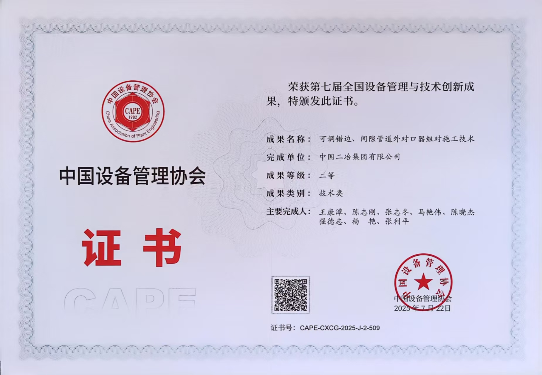 7月22日至23日,第七屆全國設(shè)備管理與技術(shù)創(chuàng)新成果交流大會在南京舉行。中國二冶申報的《可調(diào)錯邊、間隙管道外對口器組對施工技術(shù)》從2418項科研成果中脫穎而出,斬獲第七屆全國設(shè)備管理與技術(shù)創(chuàng)新成果二等獎。