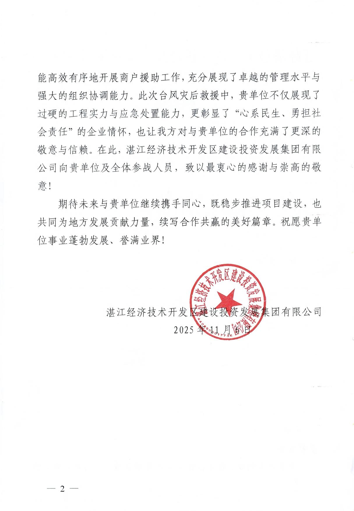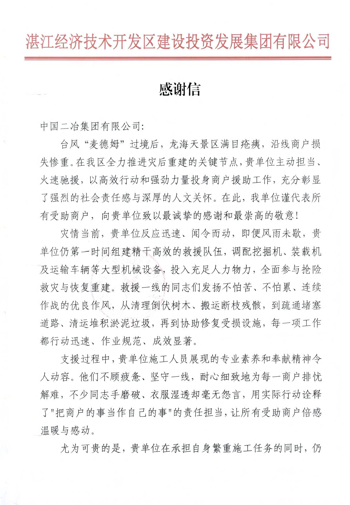 11月6日,中國二冶收到湛江經濟技術開發(fā)區(qū)建設投資發(fā)展集團有限公司發(fā)來的表揚信,對公司在臺風“麥德姆”過境后,火速馳援龍海天景區(qū)災后重建、助力商戶恢復生產生活的擔當精神給予高度贊譽。