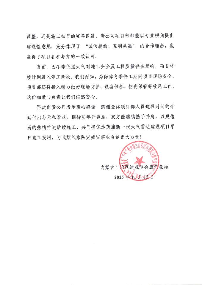 合作期間,項目部始終秉持開放協作態度,與氣象局、監理單位及設計單位建立高效溝通機制,及時反饋施工進展,主動協調解決建設中的各類問題。同時,在技術方案優化、施工細節完善等方面積極提出建設性意見,切實踐行 “誠信履約、互利共贏” 的合作理念,贏得了項目各參與方的一致認可。針對冬季低溫天氣對施工安全及工程質量的影響,項目部還細致部署現場防護、設備保養、物資保管等冬季停工收尾工作,盡顯嚴謹負責的工作態度。 此次感謝信的送達,極大鼓舞了項目部全體人員的士氣,既是對中國二冶高質量管理與實干擔當的充分認可,也為團隊注入了強勁動力。
