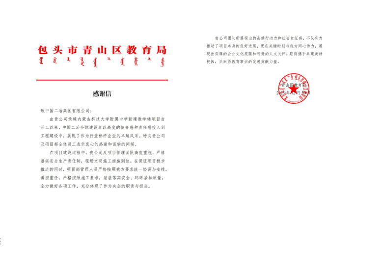 近日,中國二冶收到包頭市青山區(qū)教育局發(fā)來的感謝信,信中對中國二冶在內(nèi)蒙古科技大學附屬中學新建教學樓項目中展現(xiàn)的高度使命感及責任感表示高度贊揚。